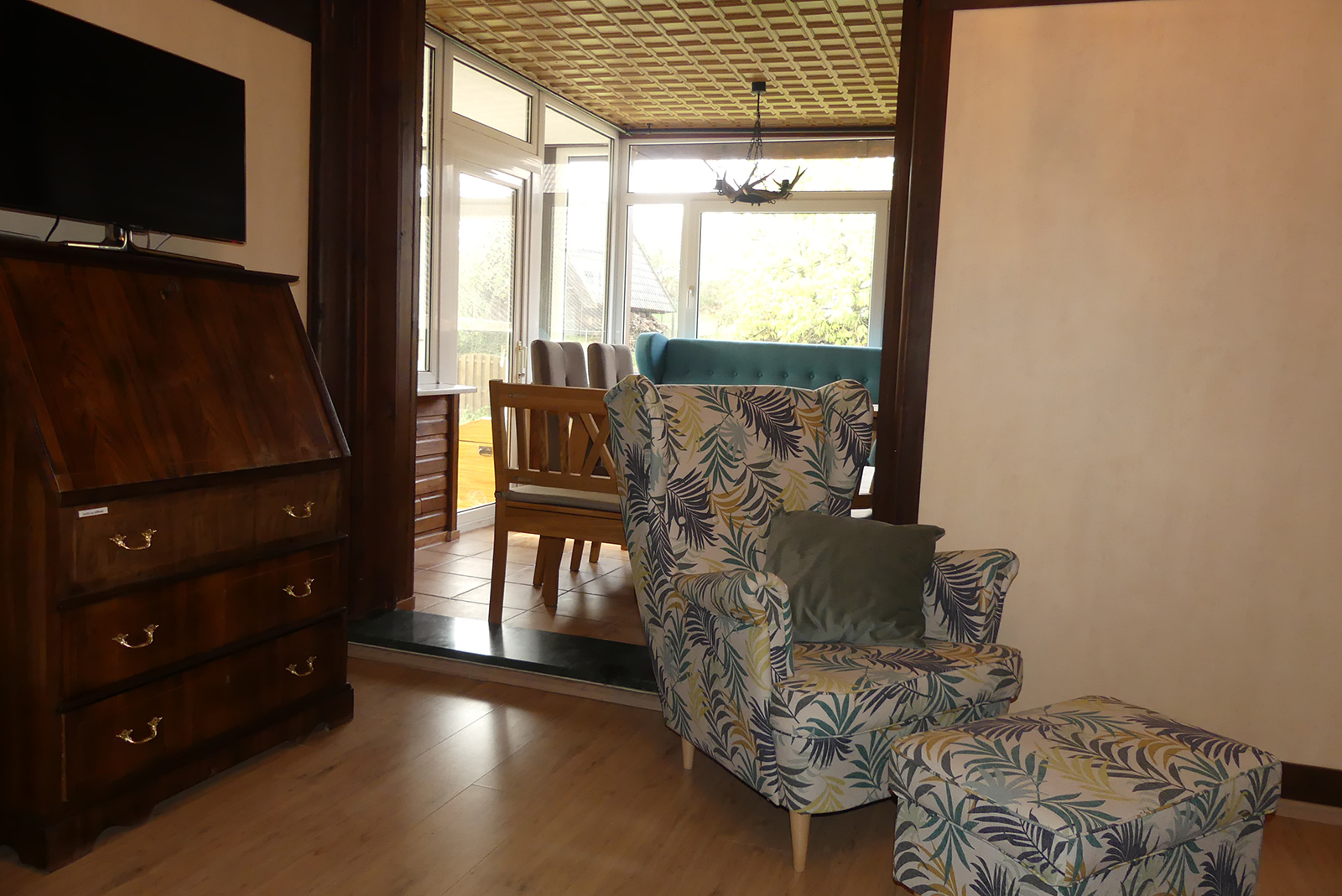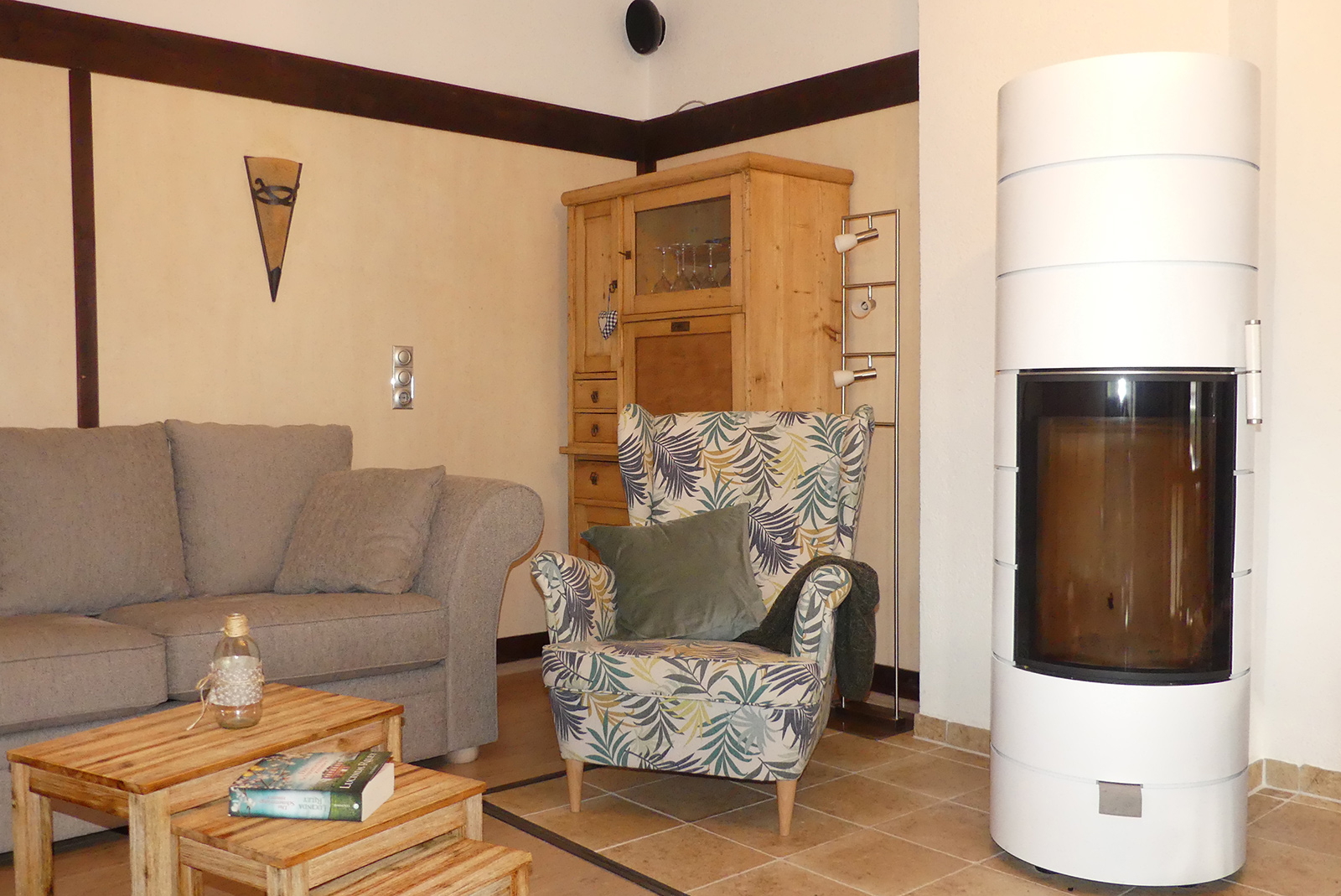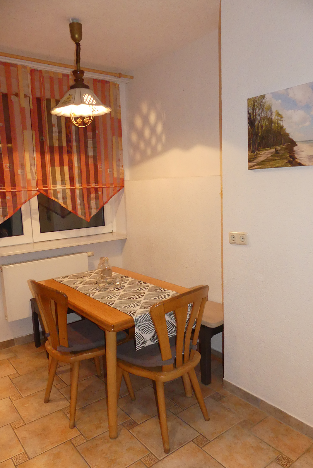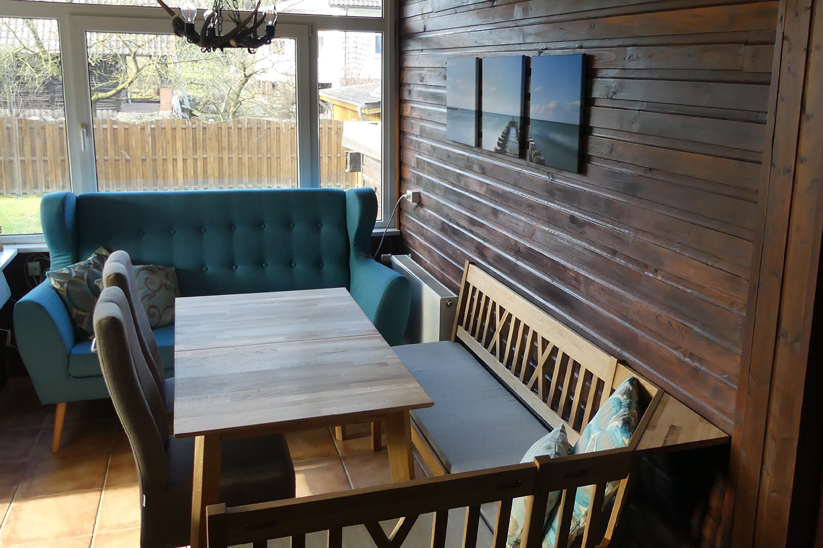 Im Erdgeschoß des Landhauses Inselsee liegen das Wohn- und Esszimmer, die Küche, das Bad, zwei Schlafzimmer und der Flur mit Garderobe, Spiegel und Schuhschrank. Zur Gartenseite befindet sich ein unbeheizter Wintergarten mit direktem Zugang zum Garten. Im Obergeschoß gibt es zwei weitere Schlafzimmer, das Kinderzimmer und ein weiteres Badezimmer. Im Wohnzimmer lädt eine Couch mit Sesseln und Hockern zum Verweilen ein. Der offene Essbereich ist mit Eckbank, Ausziehtisch und Sitzsofa ausgestattet. Sollte das Wetter einmal nicht mitspielen oder einfach ein entspannter "Haustag" eingelegt werden kann es vor dem Kaminofen, im Wintergarten oder mit den vorhandenen Büchern und Spielen sehr gemütlich werden.